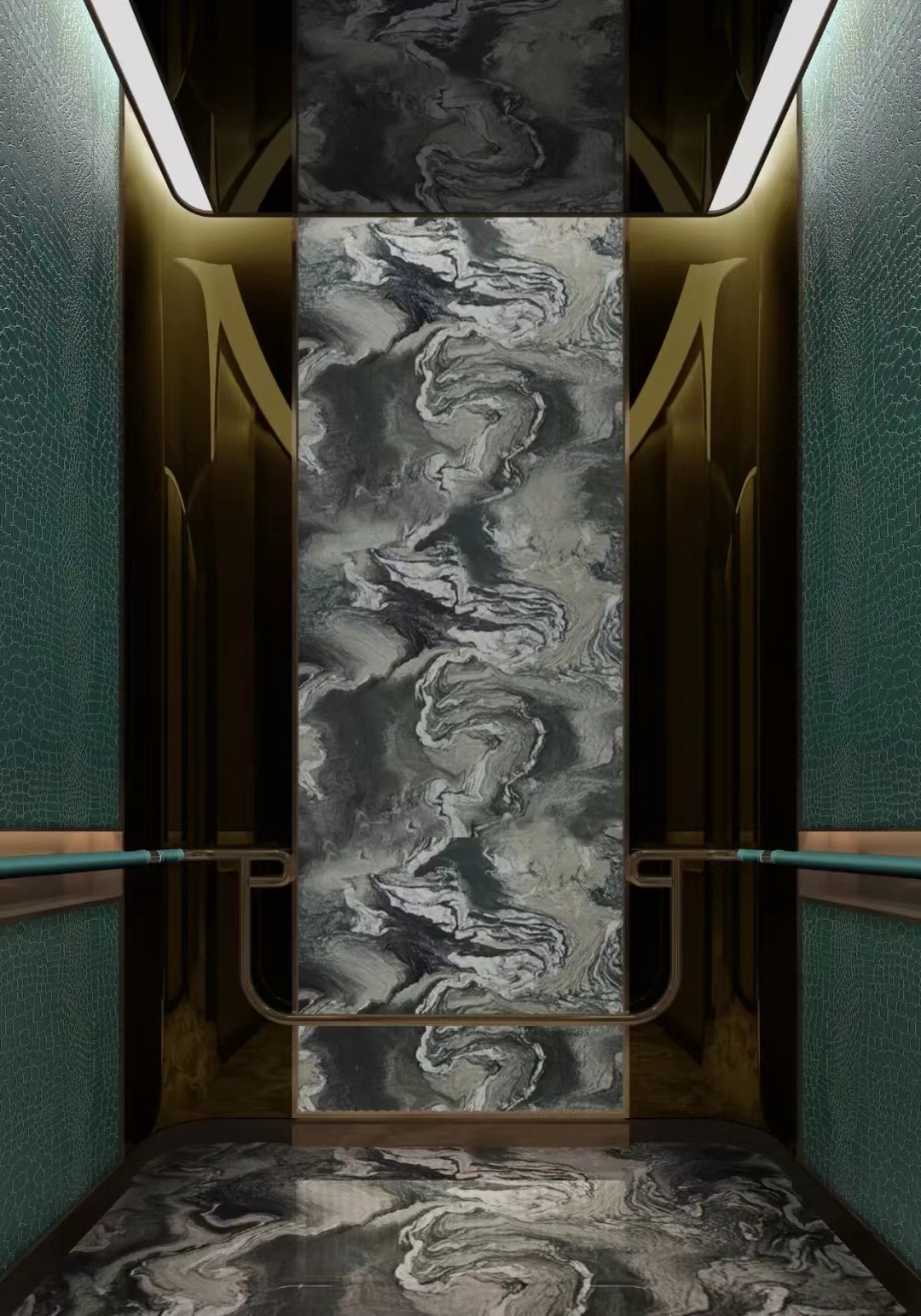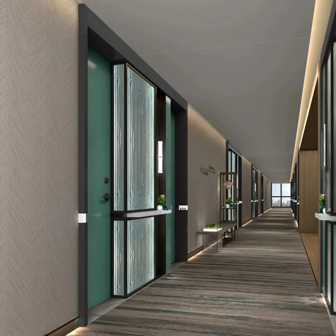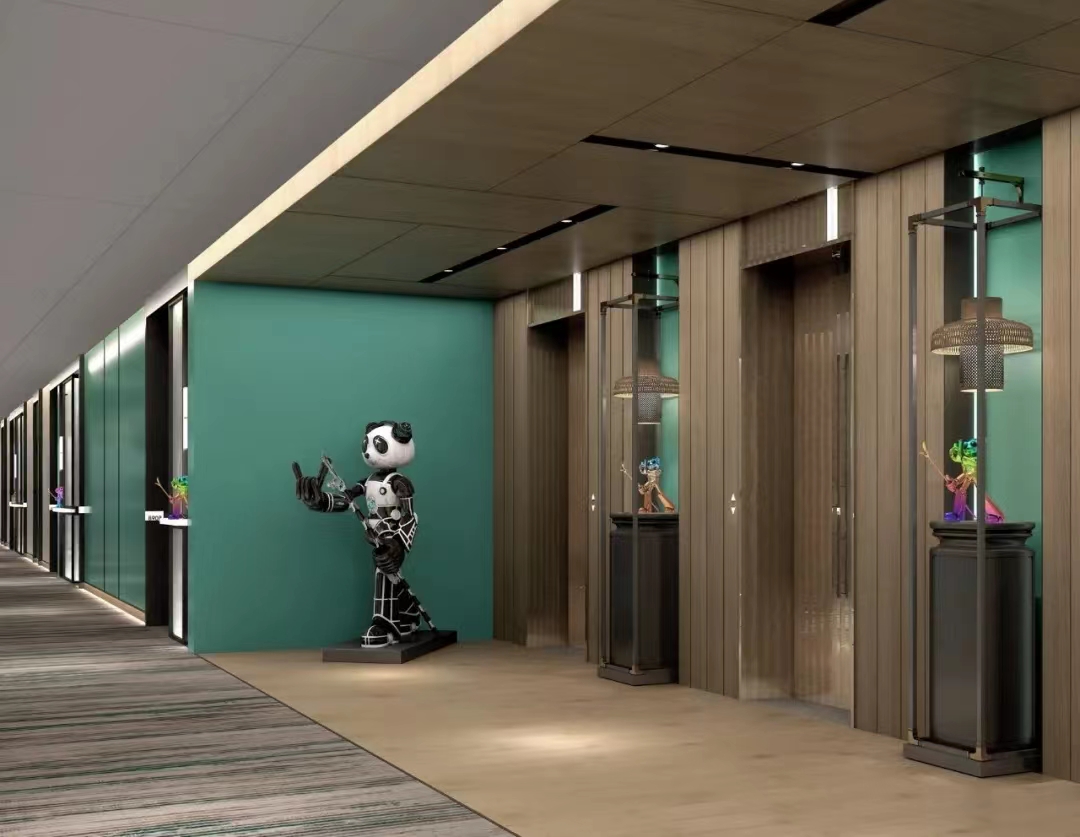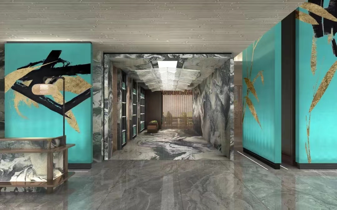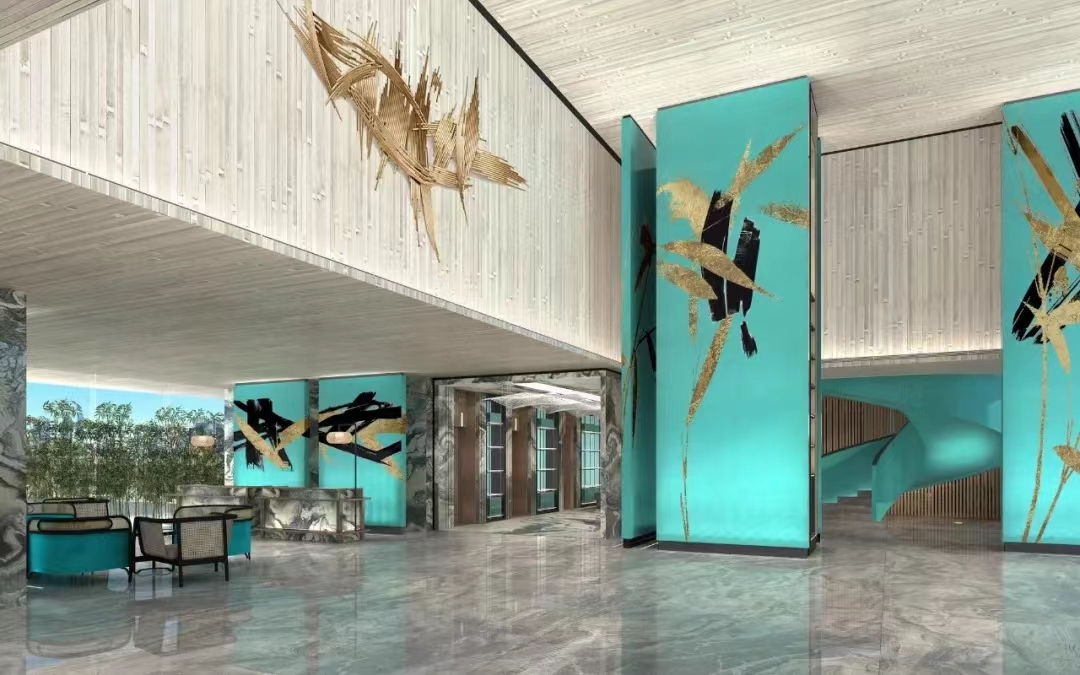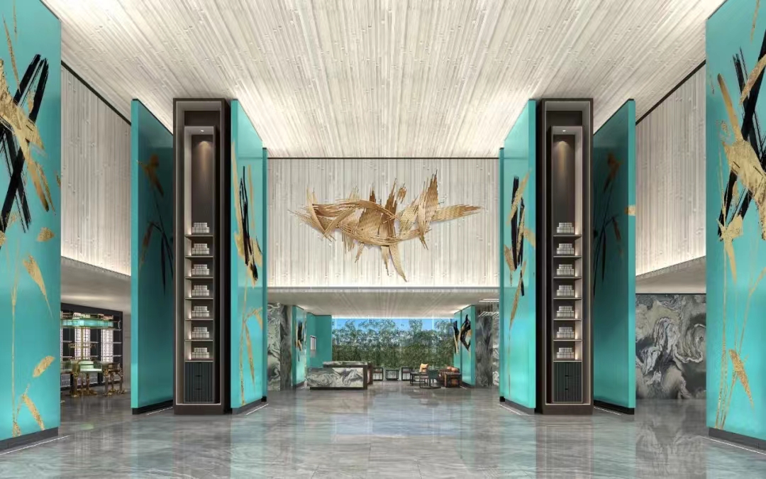 跨至大堂,竹元素构成的故事画面让人眼前一亮,碧青色木饰面上勾勒竹叶的形态,结合灯光、色彩,形成情景化的竹林感,让游客感受身处在葱郁的竹林之中。