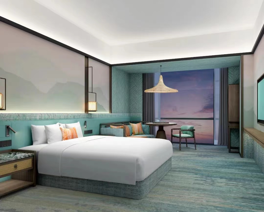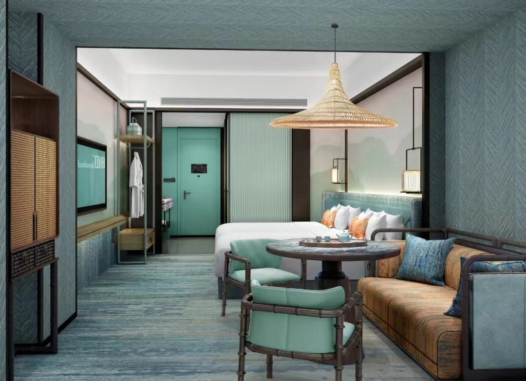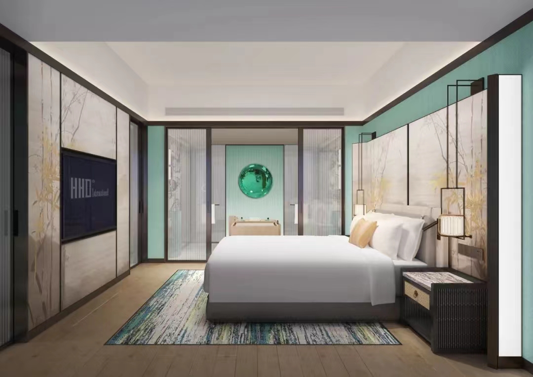 HHD假日东方设计在传承国韵之美的基础上,还遵循令住客“回归自然”的设计理念,客房整体用色淡然、素雅,低调而不张扬,将绿意氤氲的竹色贯穿整个空间,居于此,不经意间就能消弭了疲累,优雅的舒展出生活本该有的淡泊与安然。