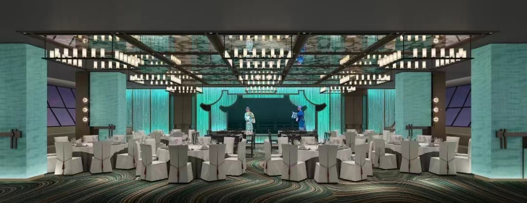 多功能厅以艺术化的视觉呈现的同时也遵循高效容纳、多元化场景交互、都市社交、活动中心等功能作用,HHD假日东方设计以材质和科技创新为支撑,用设计的笔触为酒店释放出更大价值。