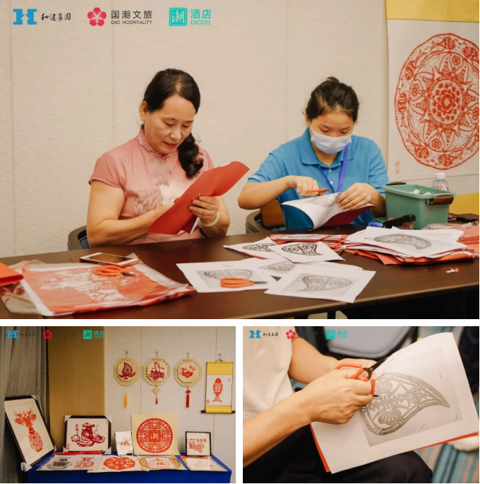 下午16点30分,潮州市潮安区剪纸非遗传承人苏少英在酒店【大师工坊】与宾客进行现场剪纸互动。【大师工坊】作为潮酒店特设的一个精品空间,意在集结名家,对话大师,与大师同行,将地方独有的文化精髓发扬光大。